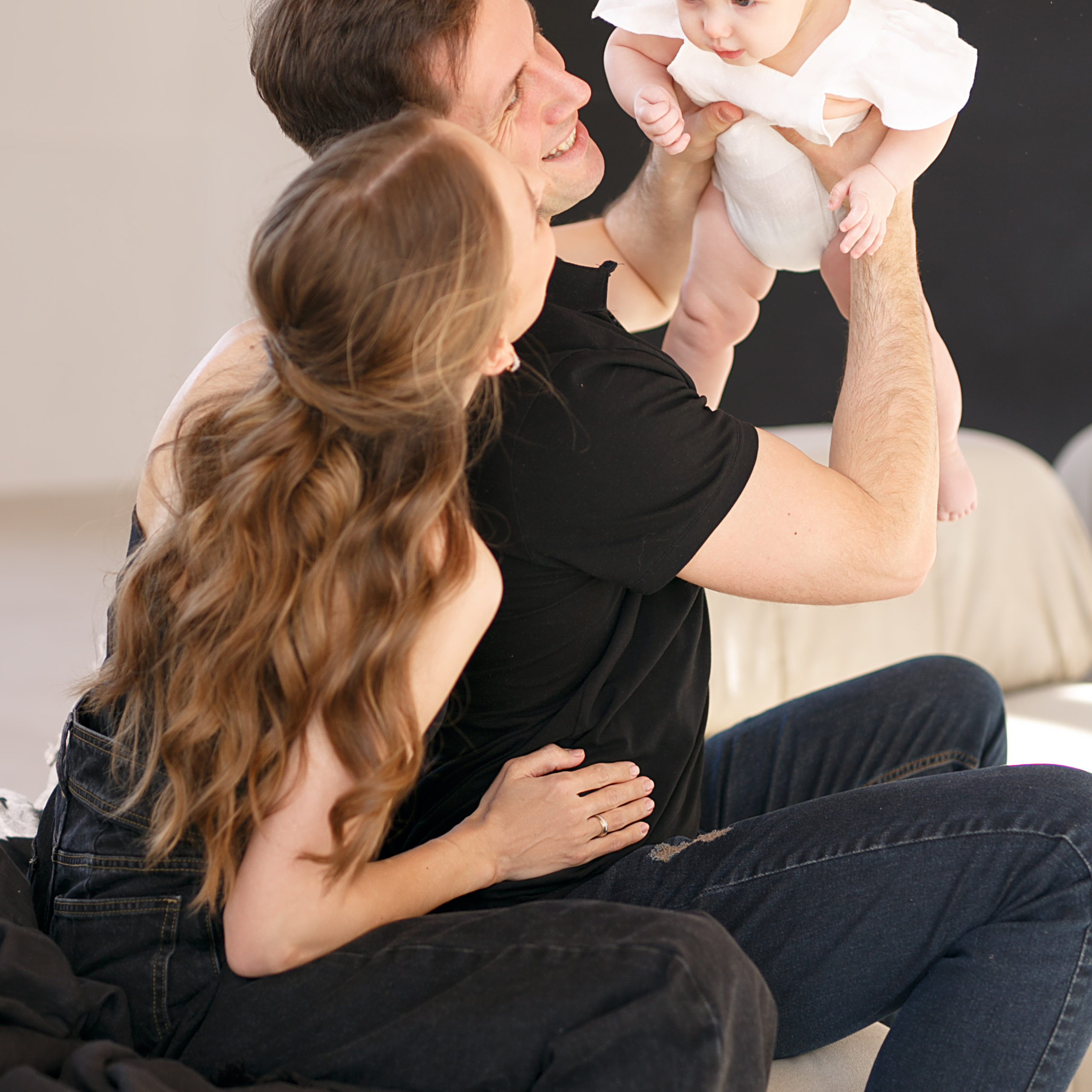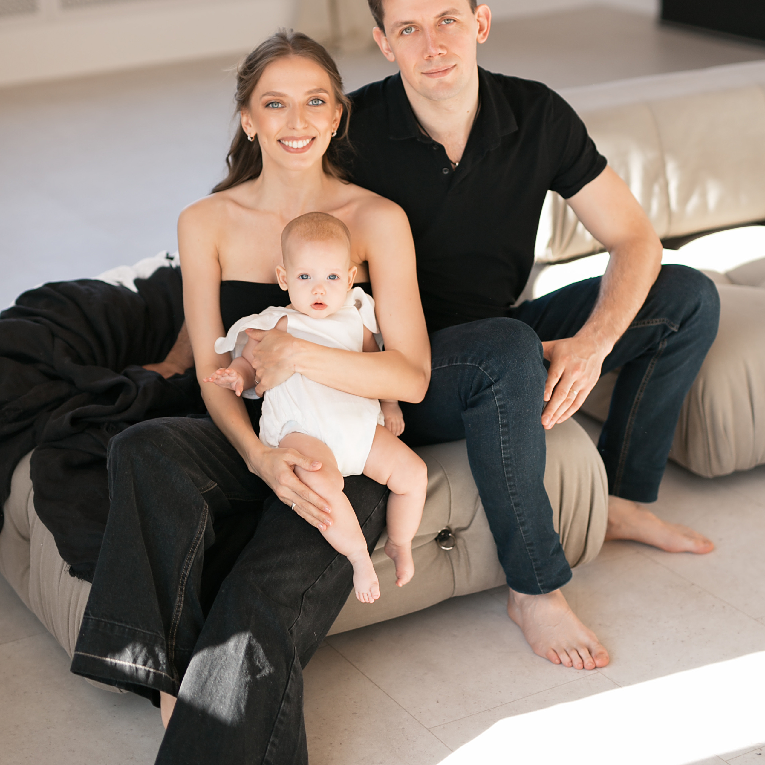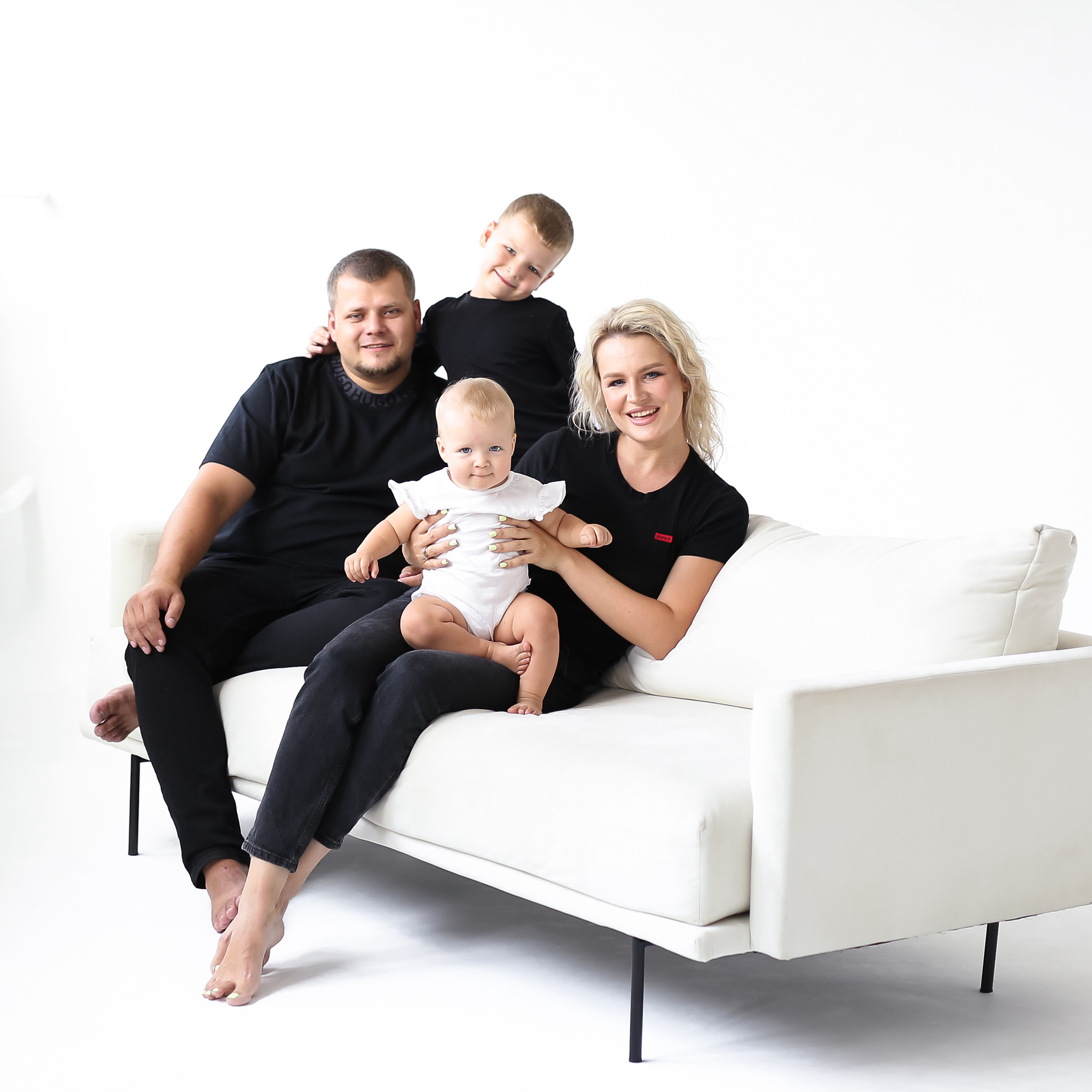 Есть белый стильный диван для семейных репортажей